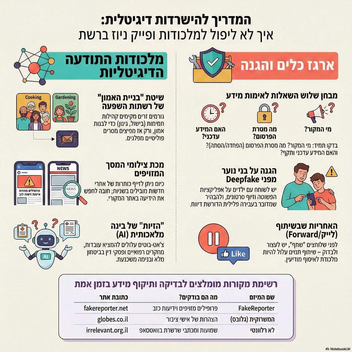 - אמינות (המקור): מי עומד מאחורי הידיעה? האם יש שם של עיתונאי? האם זה דף אנונימי או "forwarded many times"? כדאי לבדוק ברשתות אם הפרופיל נראה אמיתי – האם יש לו חברים שאתם מכירים?