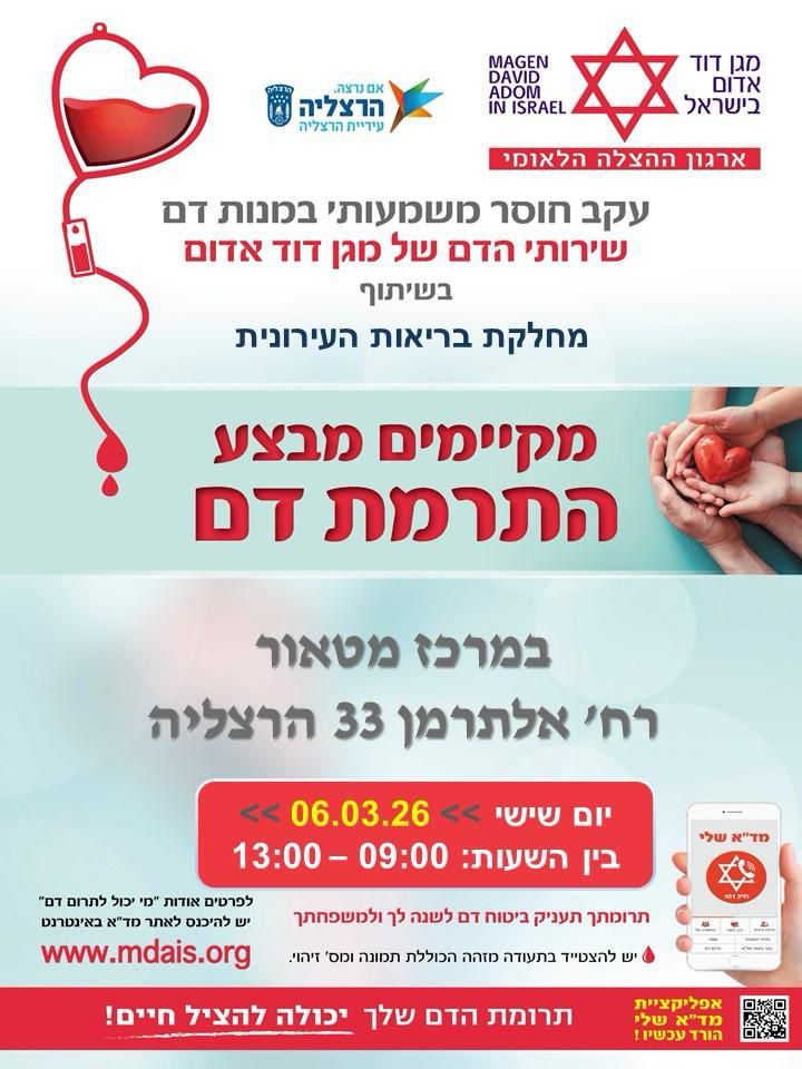 ביום שישי הקרוב (6.3) יתקיים מבצע המשך בין 9:00 ל־13:00, שוב במרכז ״מטאור״, אלתרמן 33, ובמרחב מוגן. גם הפעם – חובה לקבוע תור מראש, כדי לשמור על סדר, בטיחות וחוויית תרומה נעימה ולא צפופה.