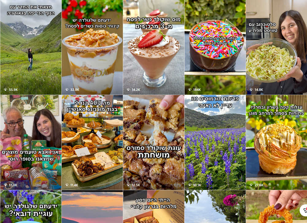 "טיולים בארץ אני מעדיפה בעיקר בחורף ובאביב, כשהכול ירוק. רוב השנה פה זה קיץ, פחות נעים. חו"ל – כשאפשר. מסעדות, בתי קפה, מאפיות ובר־מסעדות – זה הלחם והחמאה שלי". לצד אינסטגרם, היא פעילה גם בפייסבוק, טיקטוק ויוטיוב, ומעלה בדרך כלל שלושה תכנים בשבוע.